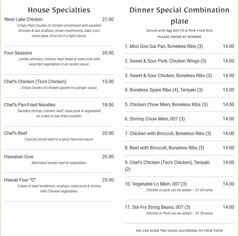 Adams locals' favorite place for fresh Szechuan, Cantonese, and Polynesian dishes for over 35 years!