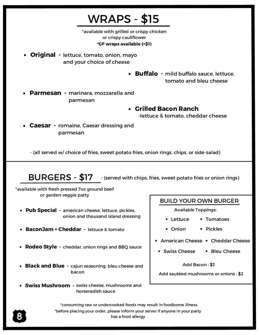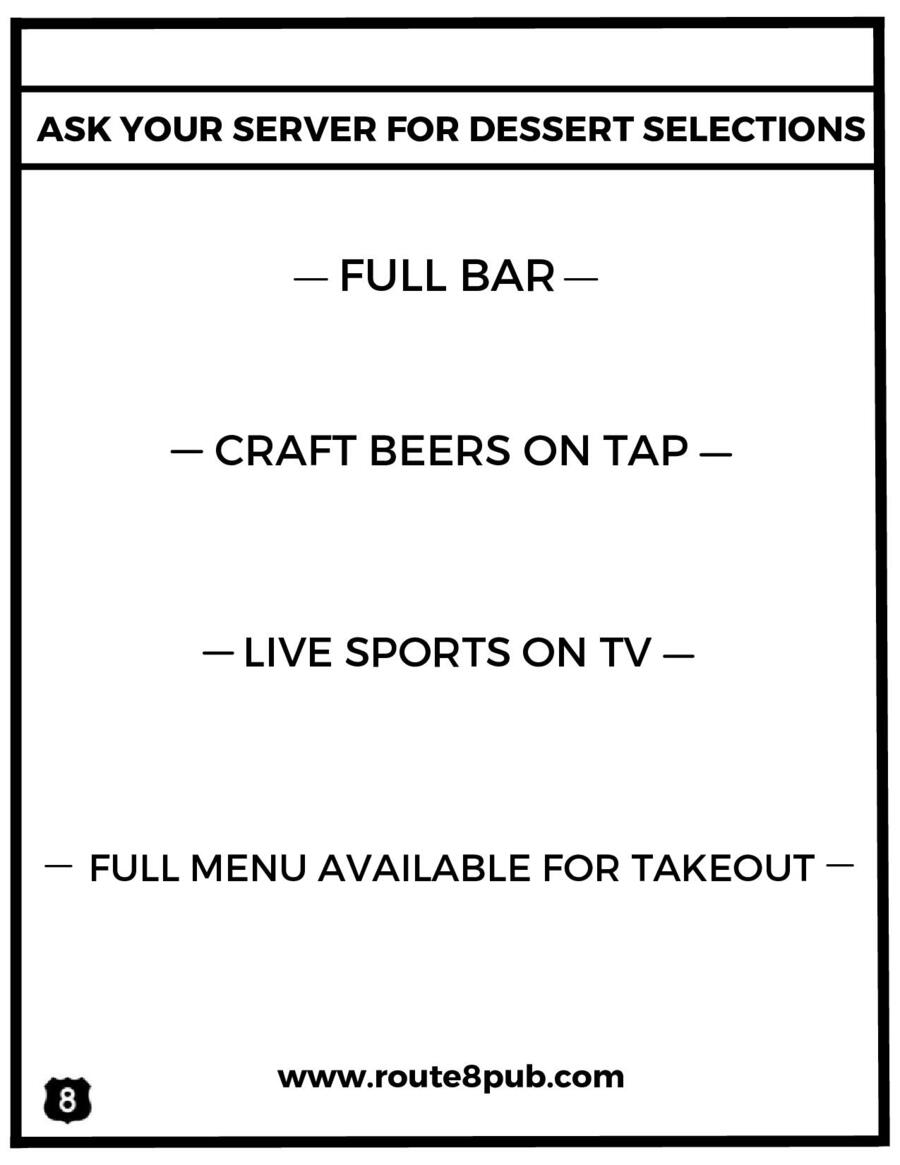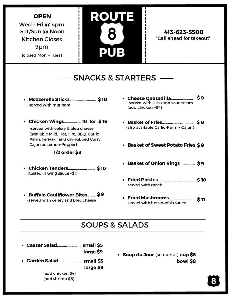 Route 8 Pub is local family owned and operated. Serving up great food, fine craft beer along with drink specialties. Come socialize in our friendly atmosphere and enjoy being served by great people.