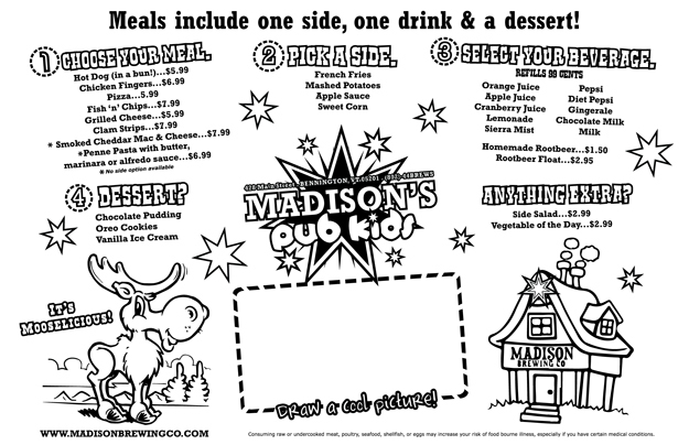 Madison Brewing Co. offers a great pub menu offering several appetizers, salads, sandwiches, ect. There are also a variety of vegetarian options. Madison Brewing Co. brews it's own beer in house. Full Bar
