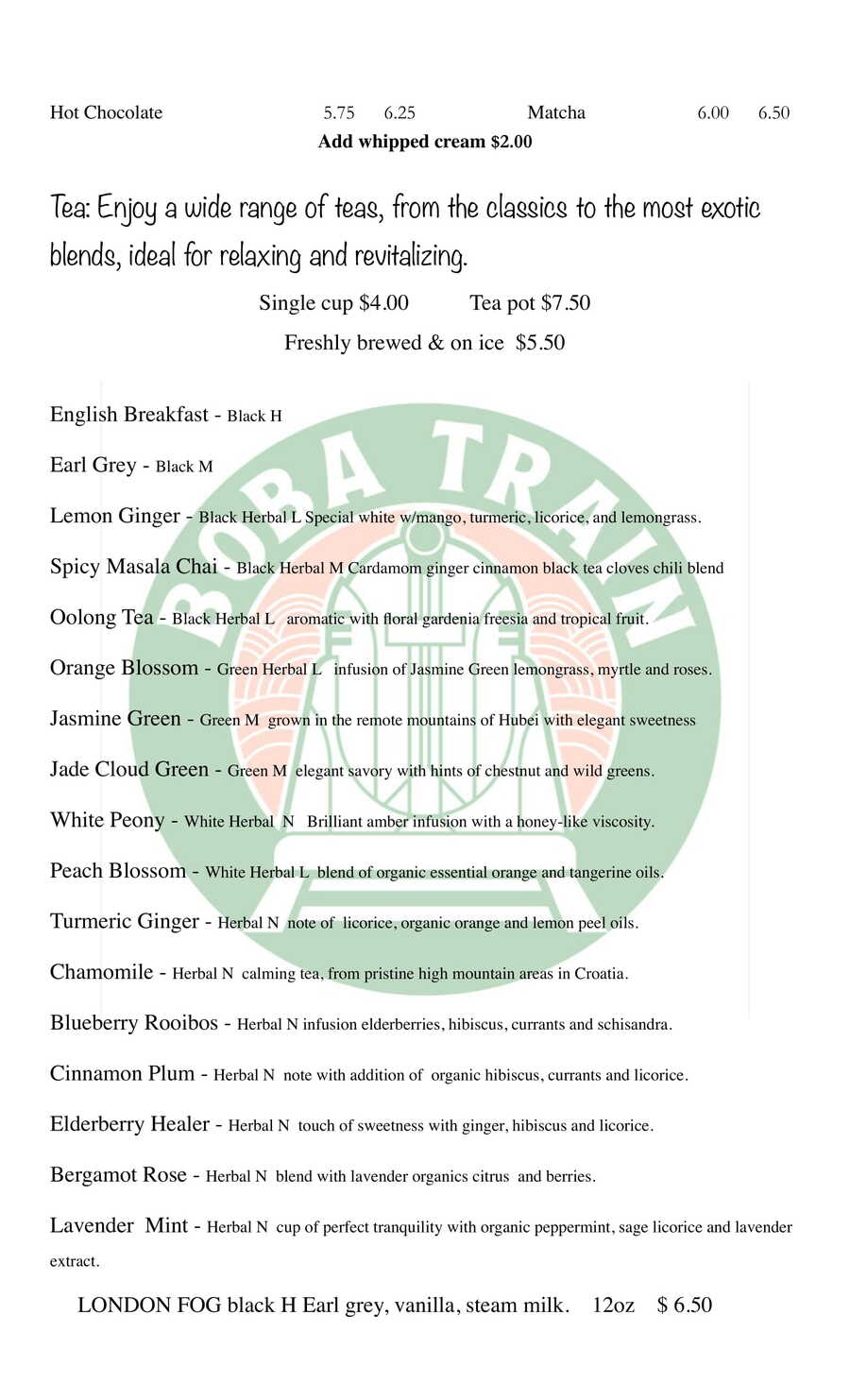 Boba Train Café brings a delightful fusion of bold flavors and comforting classics, offering a diverse menu of boba teas, handcrafted coffees, refreshing smoothies, and artisanal pastries. From creamy milk teas with chewy tapioca pearls to rich espresso drinks and fresh, fruity blends, every item is crafted with quality ingredients to ensure a delicious experience. Whether you’re in the mood for a warm cup of tea, a signature latte, or a sweet bakery treat, Boba Train Café is the perfect destination for indulgence and relaxation.