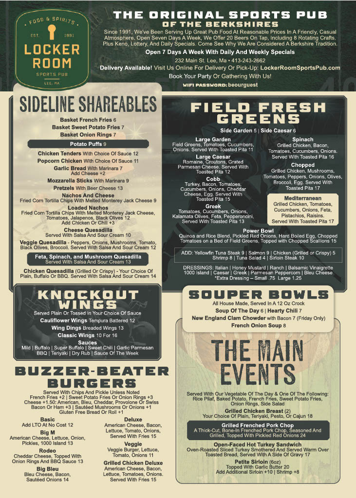 A fun family environment with the largest selection of pub food in the Berkshires! - Join us for all the best sporting events - if you cannot be at the game this is the place to be...