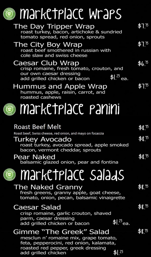 At the Marketplace Cafe, you can enjoy a delicious breakfast; signature sandwiches made fresh; jam-packed breakfast burritos; refreshing hand tossed salads; homemade soups and pastries; Barrington Coffee Roasters coffee; free WiFi; and free live music!