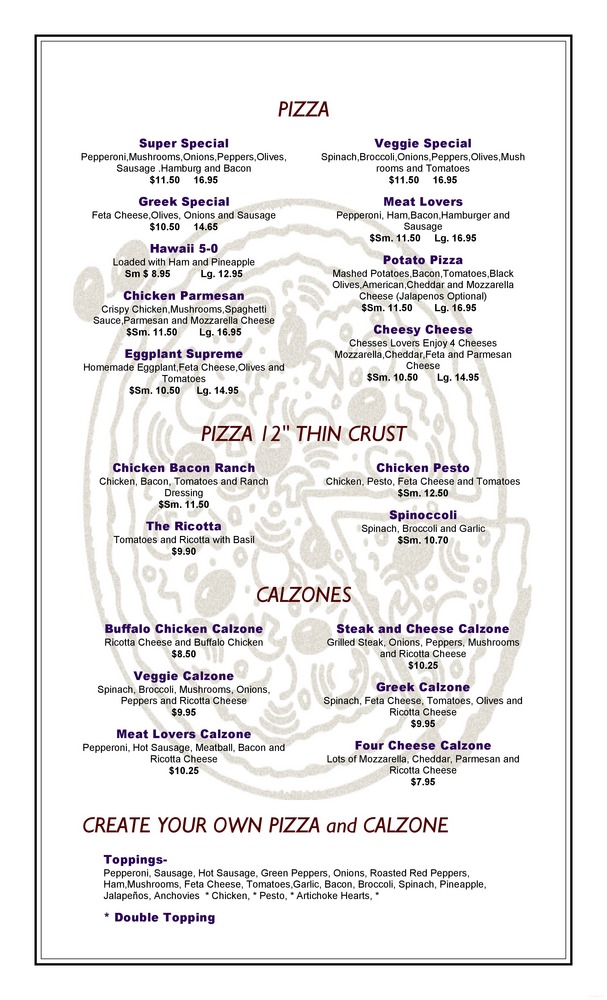 Family oriented restaurant with a complete takeout menu and full service bar available. Something for everyone! Fresh Seafood, Pasta, Hearty Sandwiches, and Our Homemade Award Winning Pizza!
